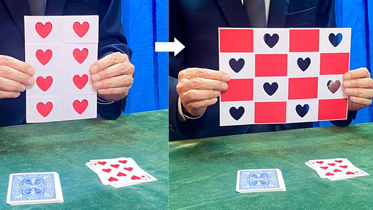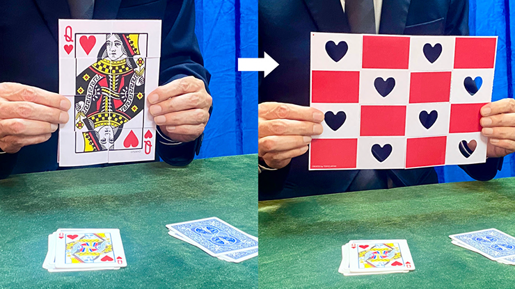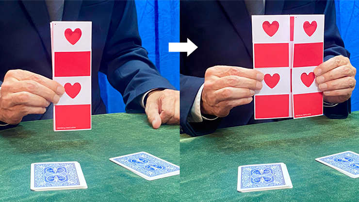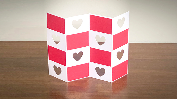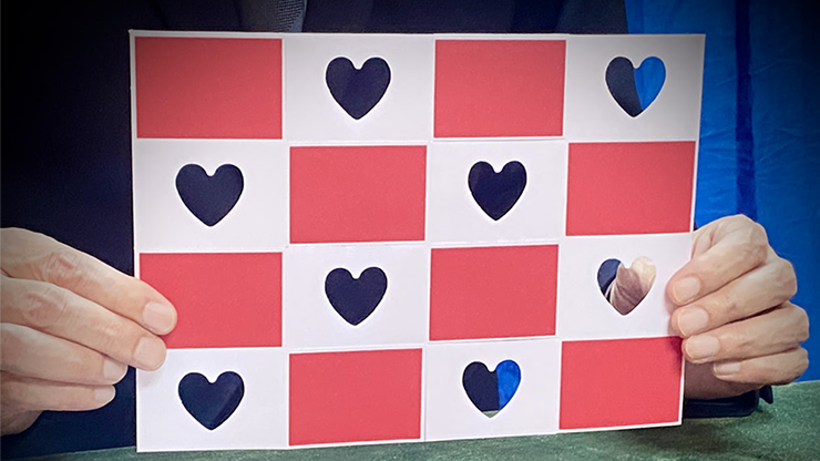 Effect: The magician removes a small packet of cards from the deck and shuffles them. He deals them into two piles, asking a spectator to stop him at any time. The cards on top of the two piles become two selections, one for each spectator. One is the Eight of Hearts, the other the Queen of Hearts, but the magician does not know this. Each spectator looks at and remembers their selection. The performer brings out a piece of paper that is colored with red and white squares, and has holes in the shape of hearts all over it. After displaying both sides of the paper, he explains that it will divine which two cards they are thinking of. He folds it and displays two hearts, asking, "Is that your card?" to the first spectator? "No," he says. The performer refolds the paper to display four hearts and again shows this to the spectator, saying "That is your card, the Four of Hearts?" "No," says the spectator. "Please give me one last try. What was the name of your card?" The spectator responds, "The Eight of Hearts." The performer snaps open the paper to reveal an Eight of Hearts. Just as quickly he pulls the paper fully open and the Eight of Hearts vanishes. The he turns to the second spectator and asks her to name her card; she says "Queen of Hearts." He folds the paper and in a snap the Queen of Hearts magically appears upon it. And with another snap the paper is pulled open and shown on both sides-the Queen of Hearts has vanished, and the paper is exactly as it was at the start.
