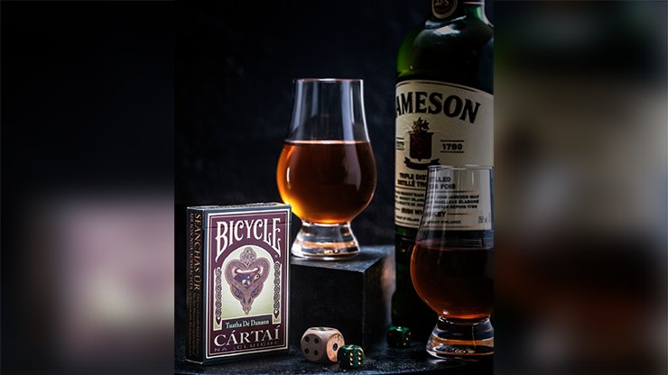 A beautifully unique hand-drawn Celtic Playing Card Deck featuring iconic images celebrating the rich Celtic tradition of Gods, Goddesses, and heroes. This deck features the Cauldron of the Dagda design from the Ace of Hearts on the face of the tuck case. On its reverse is the Twin Dragons design that connects the imagery of the sacred pool over which grew the hazel trees of divine knowledge, and in which swam the salmon of knowledge made famous in the Irish Boyhood Deeds of Fionn MacCumhaill and cognate with the Welsh story of Taliesin. Around this pool are shown twin dragons, horned serpents that invoke the image of Cernunnos on the Gundestrup Cauldron. This deck is colloquially referred to as 'The Gaelic Deck' because the language on its tuck case is primarily in a modern version of Classical Irish, the immediate ancestor of modern Irish and Scottish Gaelic.