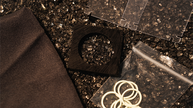 The magician places a borrowed and signed coin in the center of a hollow wooden frame. Both sides are covered and sealed with transparent sheets, securely locked with 4 rubber bands.