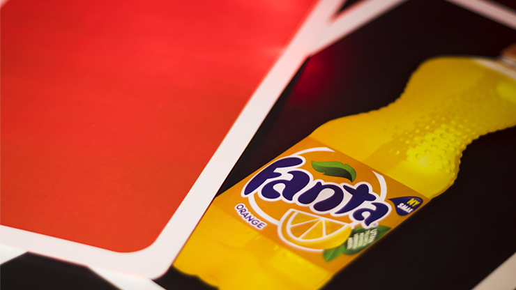 The audience can see that the cards from which the spectator must select their drink consist of duplicates of the prediction that is inside the paper bag. The spectator is now invited to select any card after the magician moves the cards one at a time from the top to the bottom of the deck. The audience is laughing since they can see that all the cards are the same. The spectator calls out the name of the chosen card (Coke) and the audience is shocked to hear that the selected card is NOT the same as the prediction, which is a bottle of Fanta that is inside the paper bag.