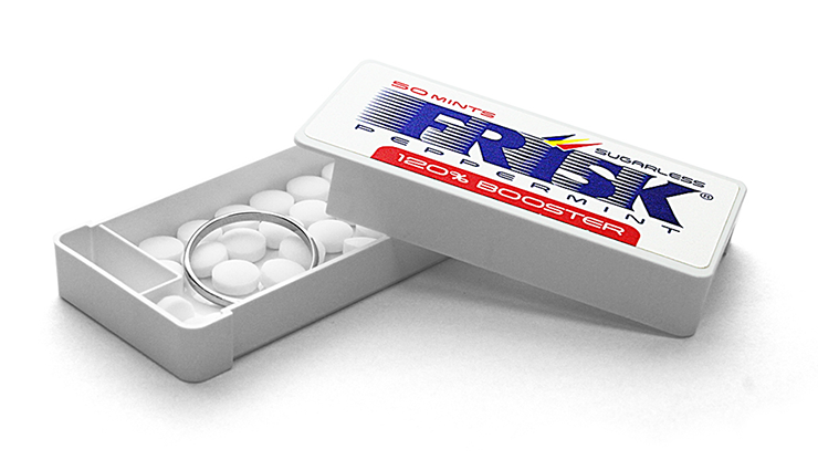 Borrow a ring from the spectator, and hold it in your left hand. Take out the sealed Frisk from your rear pocket, and tap on it...the ring is gone. Tear the film and open the Frisk case. The spectator's ring lies in it.