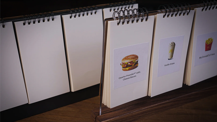 Four audience members each randomly flip through a section. Each participant selects a different food item. The magician's lunch in the box perfectly matches the items randomly chosen by the audience. It's not just the ability to predict playing cards or food, it's the complete freedom to predict anything imaginable.