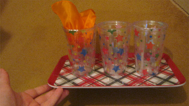 This is similar to the Classic Monkey Bar Routine, except that it uses 3 glasses upon a small tray. Inside one of the glasses is a large colorful silk.
