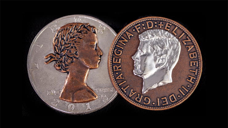 The magician holds the Silver Dollar at fingertips and gives a quick wave of his hand. The silver Head of JFK now changes into the copper head of Queen Elizabeth ii. The rest of the coin is still silver.... Only the head has changed.