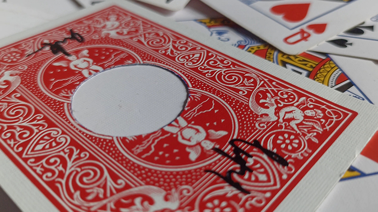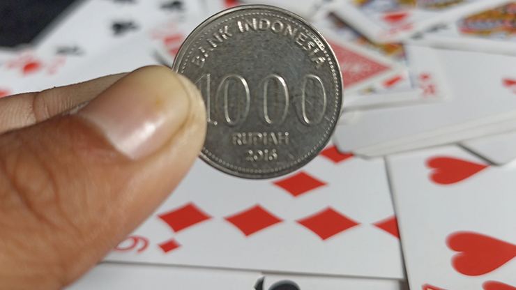 Now show the round disc, the piece of card punched out from the middle of it. You draw for example 25 cents on the round piece of card. Now you place the disk on the card and pass it through the deck and that little disc has turned into a real 25 cent piece. The Midas touch.