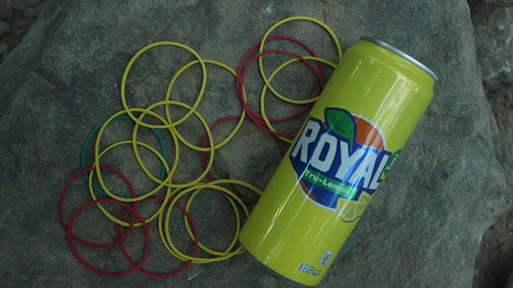 Imagine this you borrow a soda can and magically make a rubber band visually appear on the top of the can!