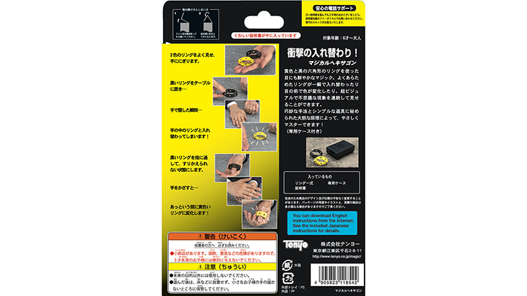 This snappy trick uses two hexagonal rings, one yellow and one black. Each ring is punched with a series of holes. After showing the front and back of each ring, they instantly change places and change color in increasingly visual and surprising ways. You will be able to master this trick in no time flat, thanks to the clever method and bold principle built into the simple props.