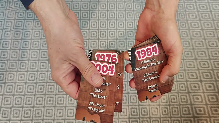 You give them a deck of cards with three songs per card, from the last 53 years. They have a free choice to think of any song from a whopping total of 159!