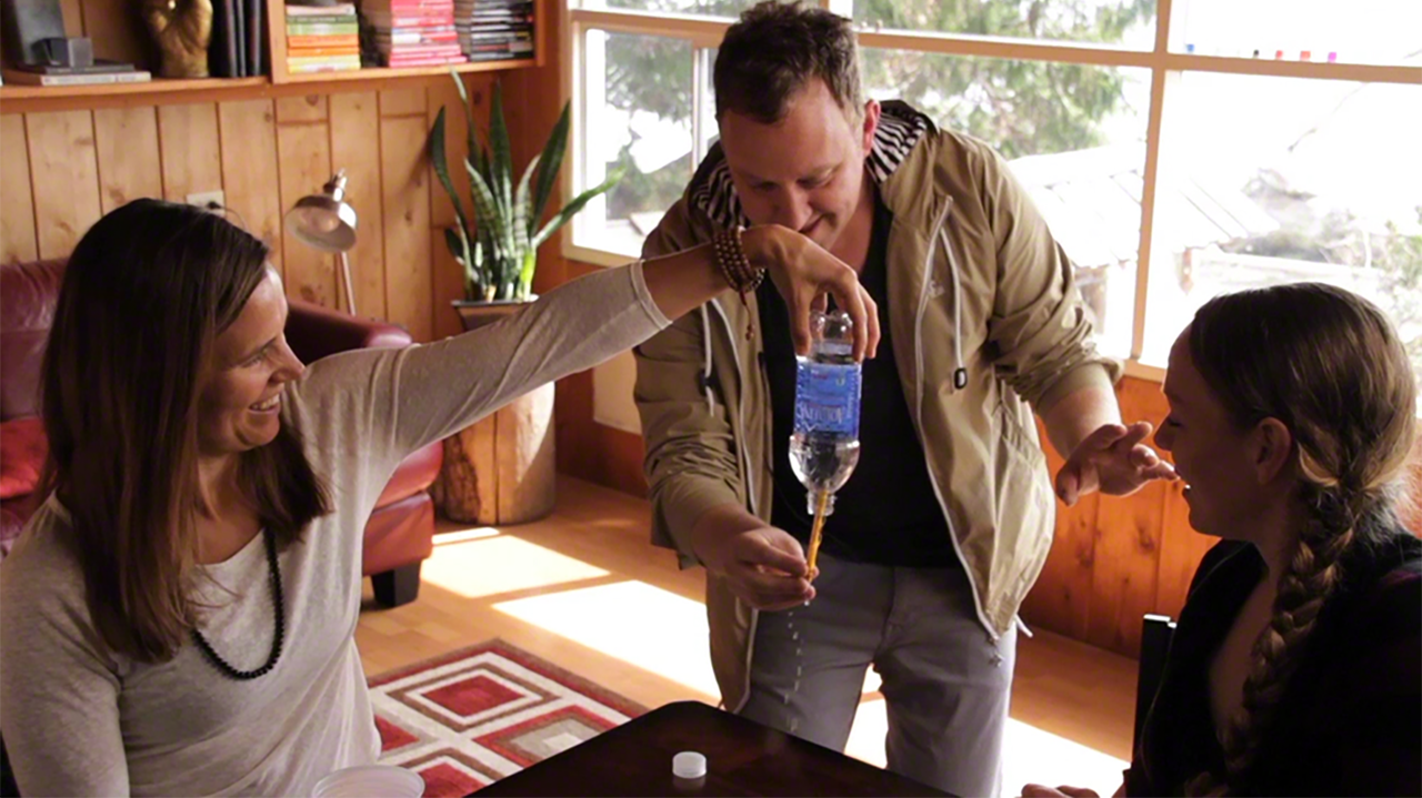 A weird science "experiment" where a spectator drops a special blue ball into the open bottle of water. The ball slowly sinks down through the water. You turn the bottle mouth down...the blue ball slowly sinks down again...and finally drops out of the bottle...somehow leaving the water suspended! This cool visual is also a brilliant convincer that nothing is secretly blocking the water.