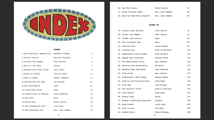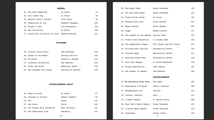 The 359 pages of this book contains 97 effects for close-up - stage - mentalism - children, etc. Taken from written instructions and books, to watched performances and word of mouth instruction. Here are the cherished ideas of Annemann, Stanley Collins, Paul Curry, Cy Endfield, Robert Harbin, R.W. Hull, Stewart James, Jordan, Milton Kort, Ed Marlo, Clayton Rawson, Harlan Tarbell, Edward Victor and many more.