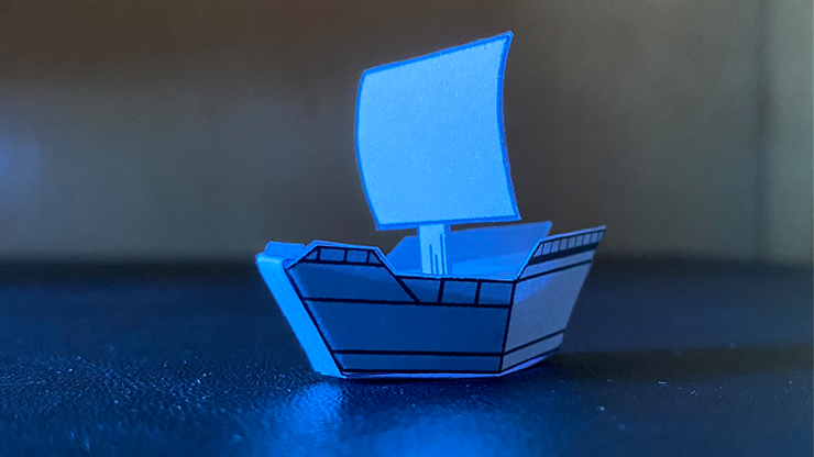 When he shows the card, magically a drawing begins to materialize on its back, forming a 2D boat. When everyone thinks the magic is complete, the magician turns this drawing into a real 3D boat, which can be given away for the spectator to examine.