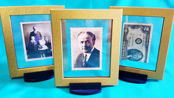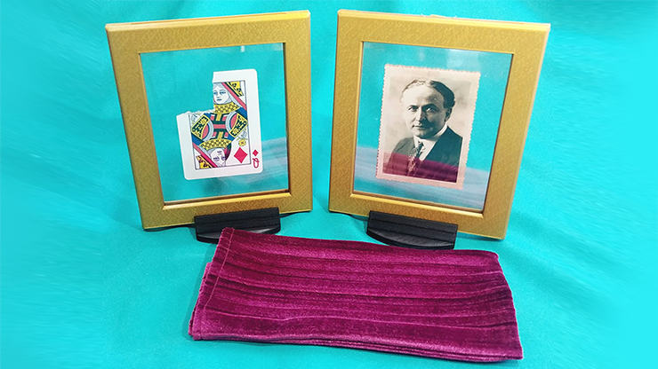 The magician shows a golden frame that he takes out of a bag. It has a very old photograph of Harry Houdini. The photograph is between two glasses and can be freely shown on both sides.