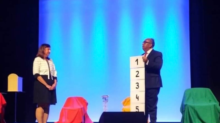 You ask a participant to choose the future for the world by displaying 5 boards with five numbers on it. The participant makes their selection, and you reveal to the audience what they selected which reads "PEACE," which is good thing of course.