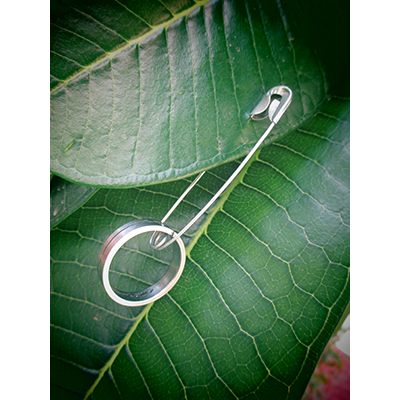 You throw a solid ring on a safty pin and its penetrate thru the pin and link's togather Visually . it's a very visual link and leave your spectator jaw drop . No gimmicks are used you can borrow these thing . Ready to go anywhere.