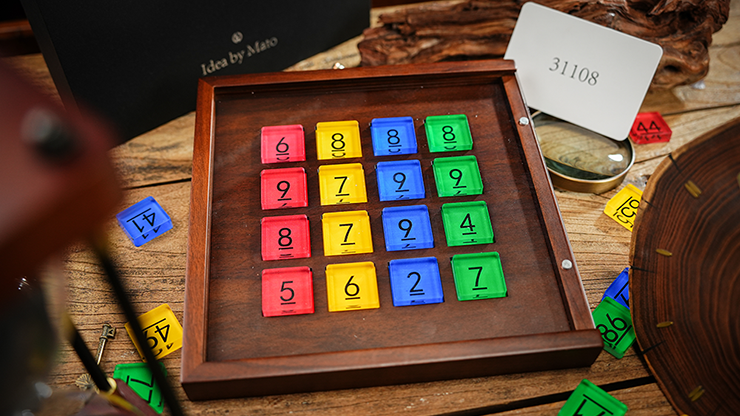 Your Audience Volunteer freely arranges the vibrant acrylic number tiles however they wish on a beautifully crafted walnut display board.