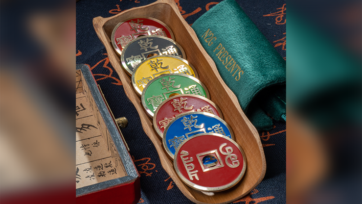 You show five ancient Chinese coins of different colors. Their colors are one of the rainbow, except the black coin. You let the audience hold these five coins, and the black coin disappears in the hands of the audience and appear wherever you like.