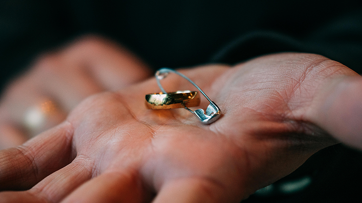An ordinary safety pin is fully examined by the audience. A finger ring is borrowed.