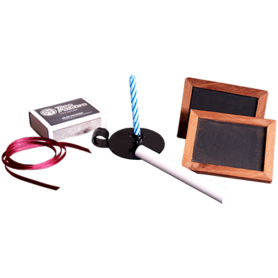 The spectator mentions his card close to the candle flame, like a ritual, and then the magician unknots the ribbon and shows that now the name of the card is written in chalk on one of the slates.