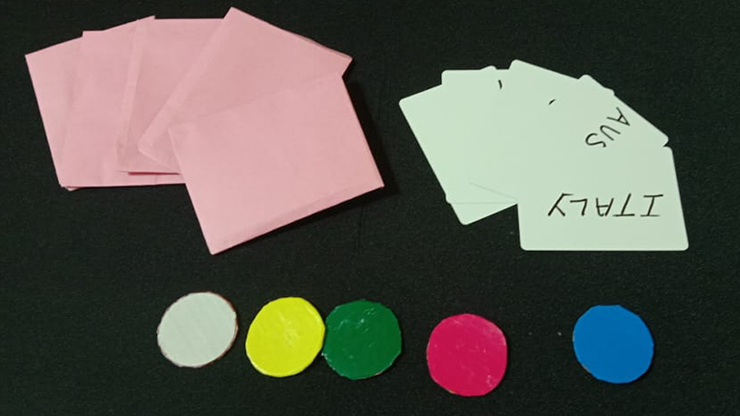 The performer hands over a paper containing a set of instructions to the spectator & brings forth a few envelopes. The envelopes are opened & are found to contain cards bearing names of various countries such as India, Australia, USA, Argentina & Italy. He places the cards back inside their respective envelopes & hands them over to the spectator for thorough mixing. Next the spectator is instructed to place the envelopes in a row on the table in any order he wishes. The performer then takes out a prediction card & places it on the table in full view of the spectator .Next, he hands over the spectator 5 different coloured chips. One of these chips is selected by the spectator.The performer also asks his volunteer to call out any number in between 1 & 10.